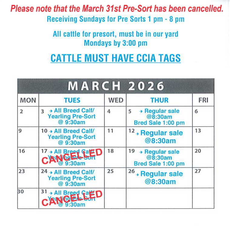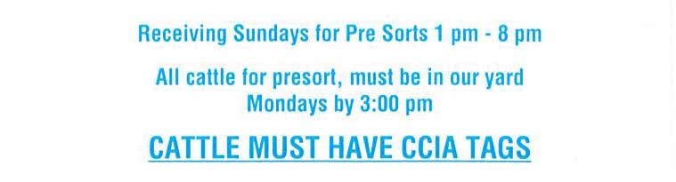 All cattle must have CCIA tags. If your cattle arrive at the market without tags they will be tagged when time allows. We will NOT use owner supplied tags.